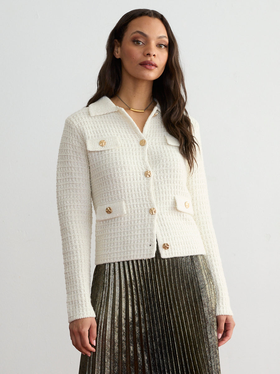 Upgrade your wardrobe with this exquisitely crafted tweed-like jacket, made from a luxurious cotton-wool blend with a subtle waffle texture. Designed with four decorative faux pockets and finished with star-pinched, hammered, brushed gold buttons, it combines classic tailoring with distinctive, eye-catching details. Perfect to add a glow-up to every outfit.