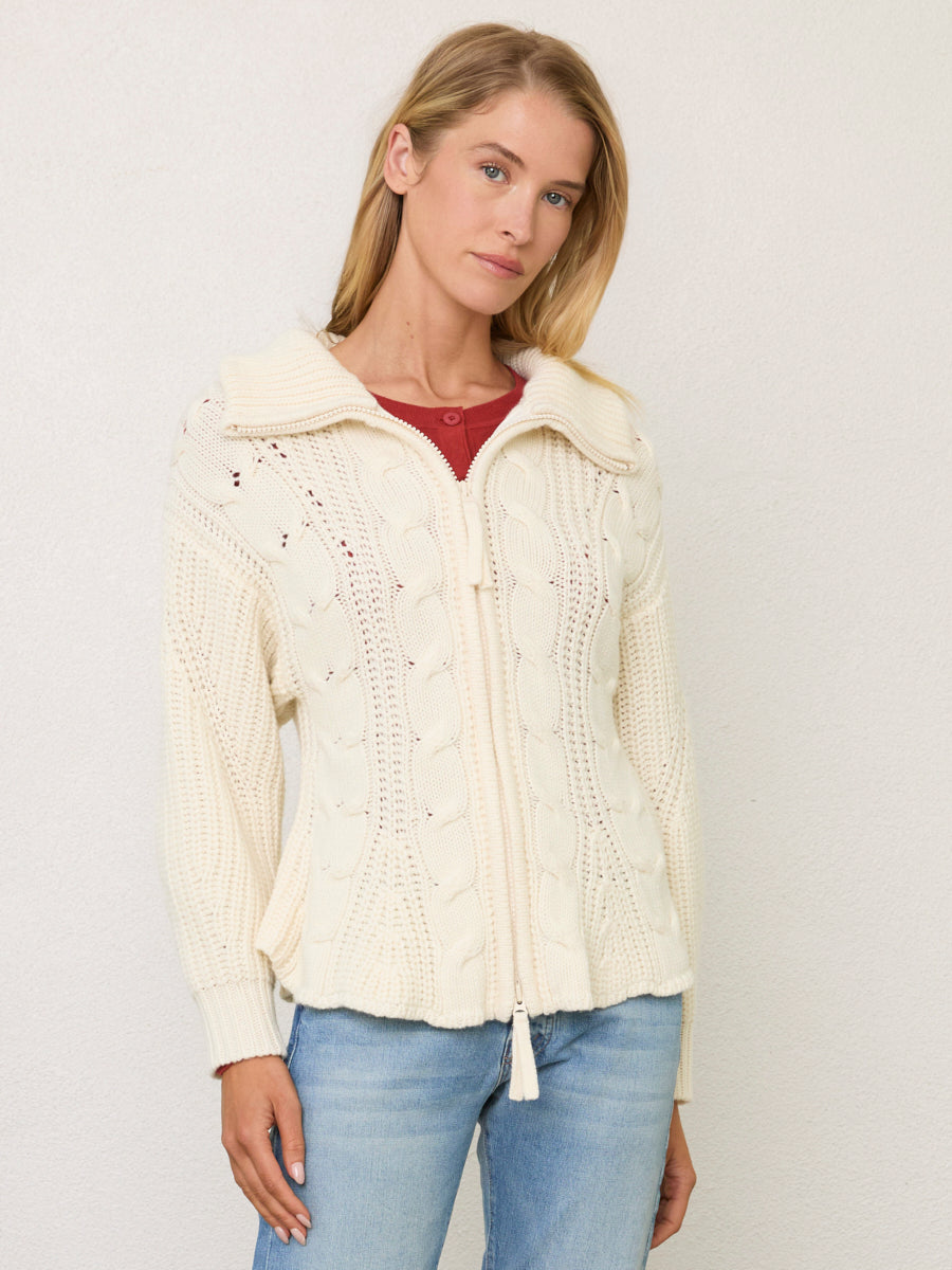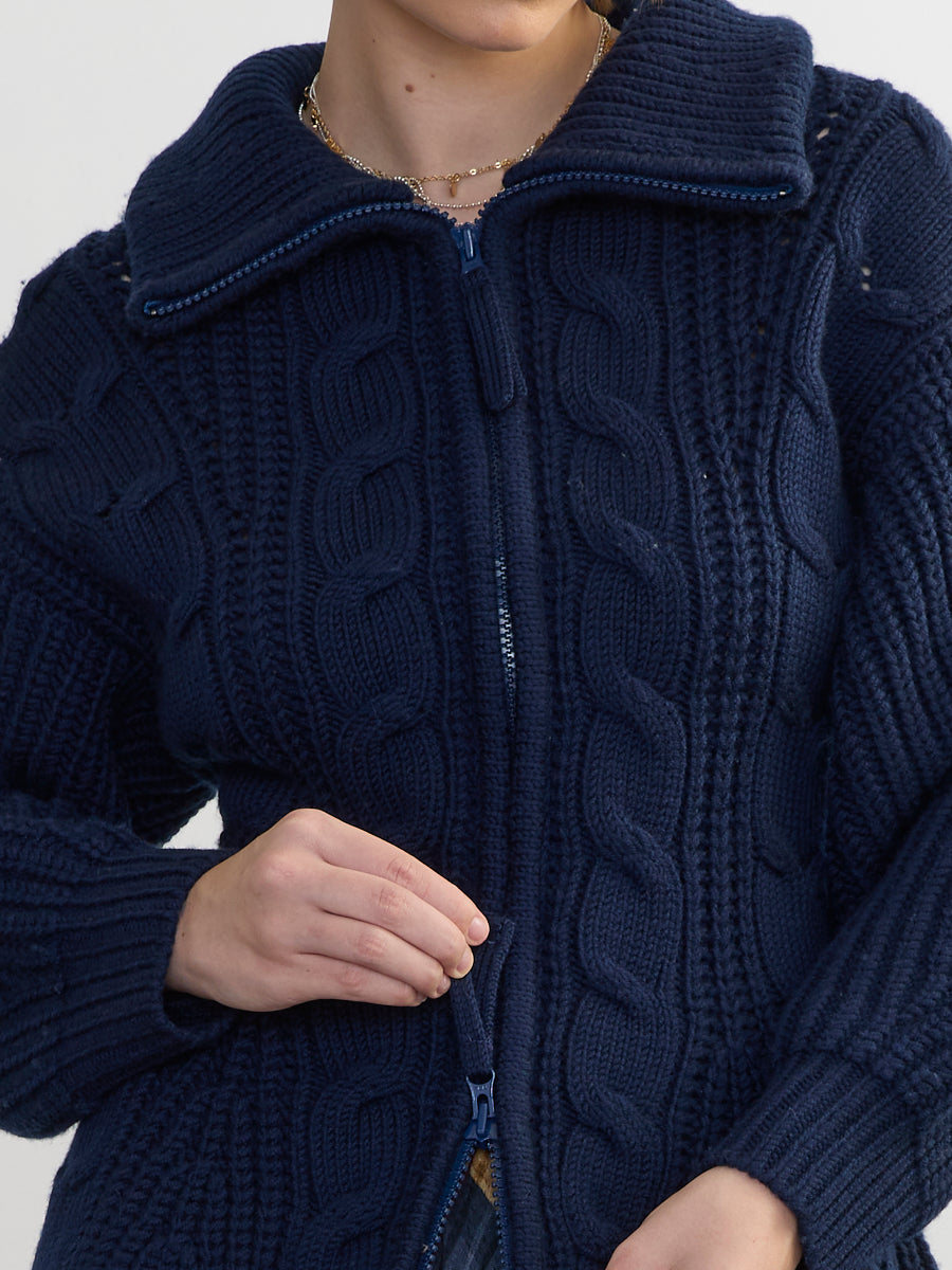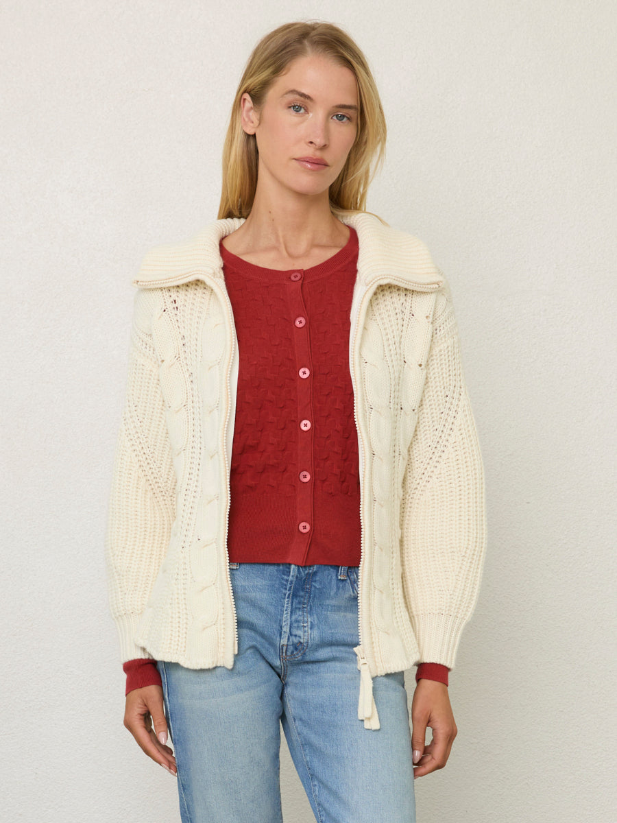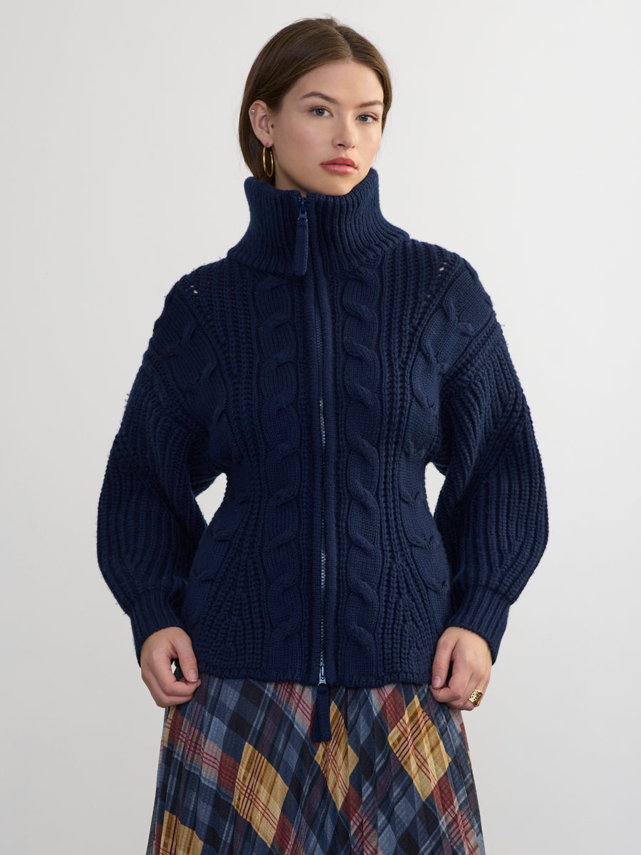 A showstopping zip cardigan with an engineered hour-glass silhouette exemplifying our commitment to craft, quality, and luxury. A high collar and voluminous sleeves bring a fashionable flair. Made to keep you warm winter-long in our merino wool, which is more durable, breathable, and has a softer hand than standard wool. Our favourite detail is the 2-way zipper, providing more versatility. Unzip each one 1/4 is the way to offer more waist definition, if desired.