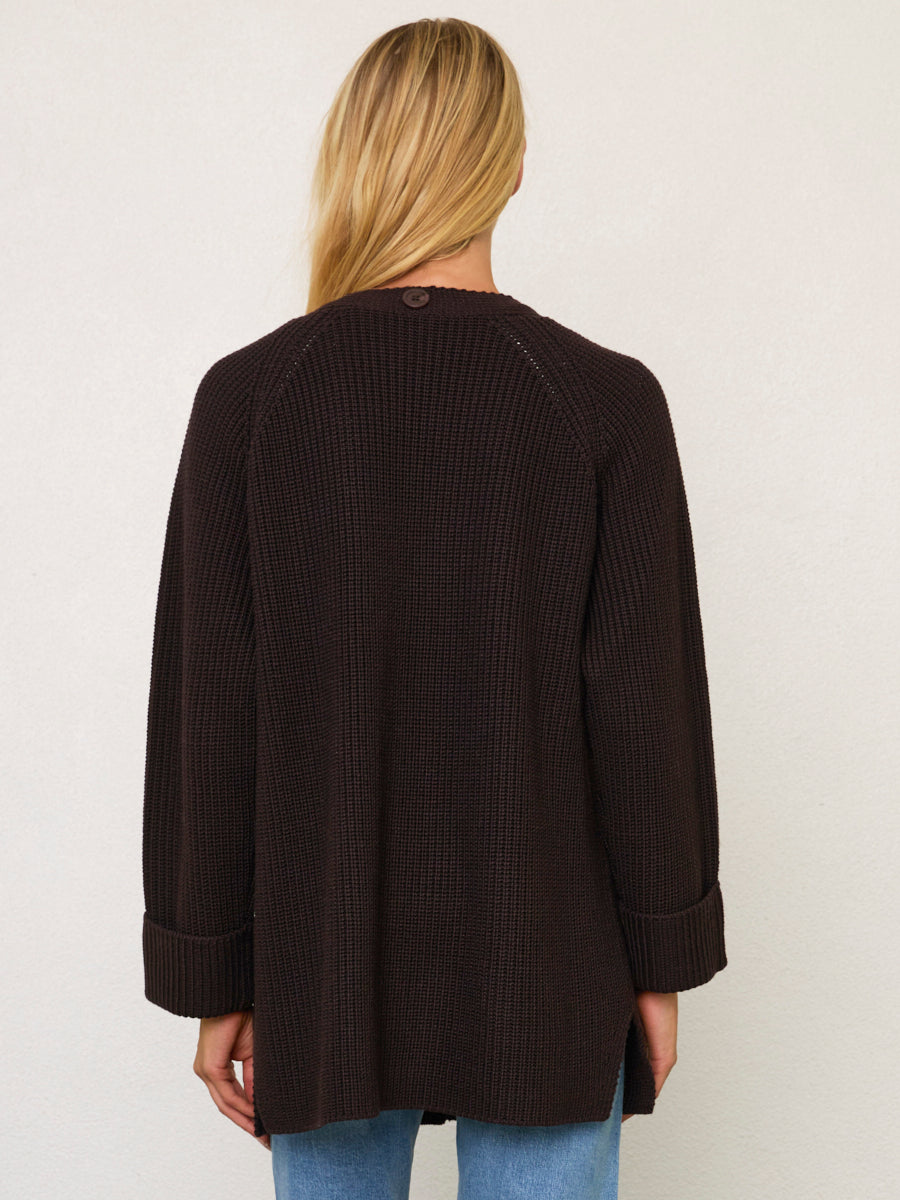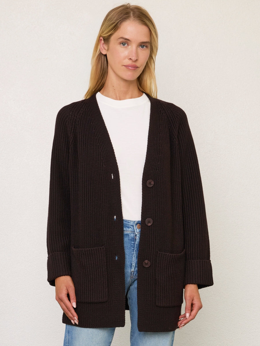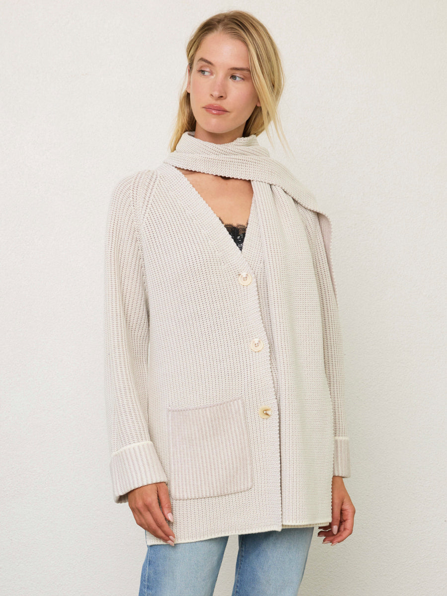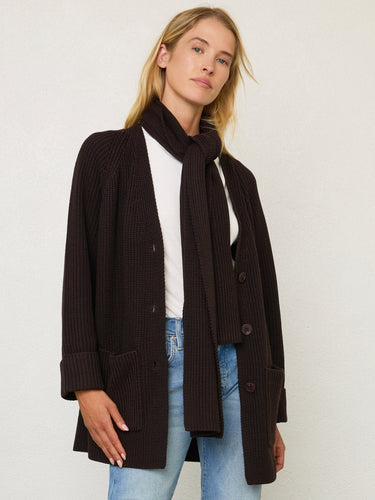 Part coat, part cardigan, part scarf = knitwear heaven. This extra-warm, ribbed V-neck coat includes a matching, detachable scarf. Sleeves are full and cuffed to provide extra warmth, while patch pockets allow for easy access to your phone, keys, and MOL texting gloves.