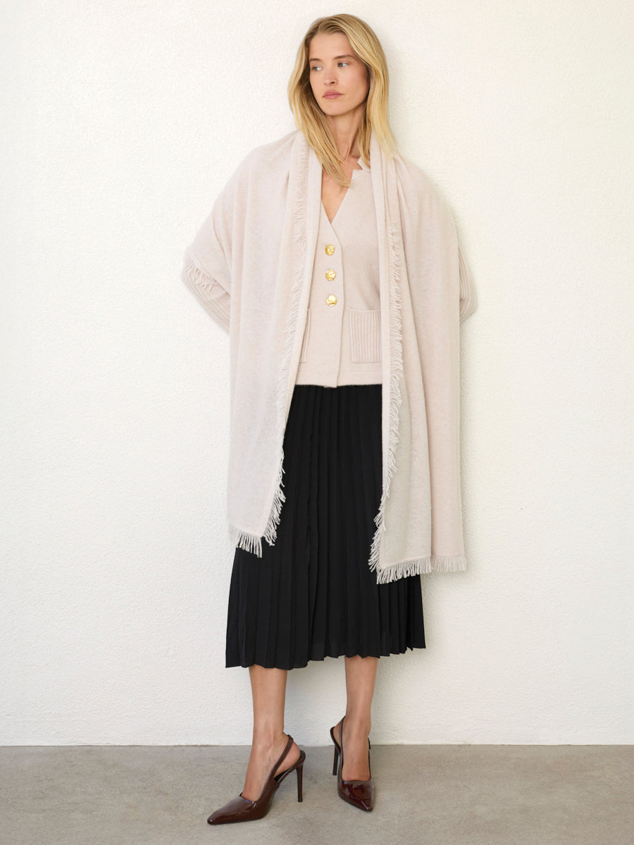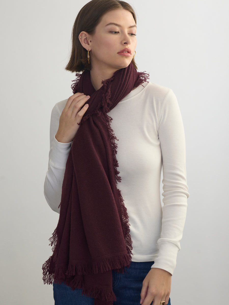 Crafted in a fine-gauge weave, this airy cashmere scarf is feather-light yet warm. Finished with soft fringed edges, it drapes effortlessly for timeless elegance—perfect for cool mornings, travel days, or evenings out. An everyday touch of luxury.