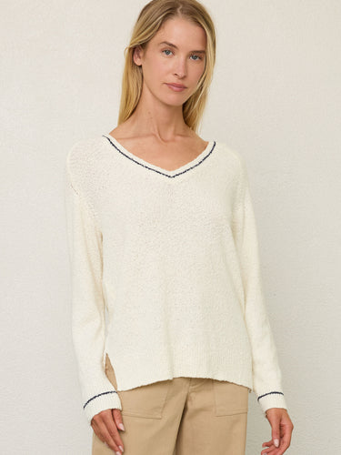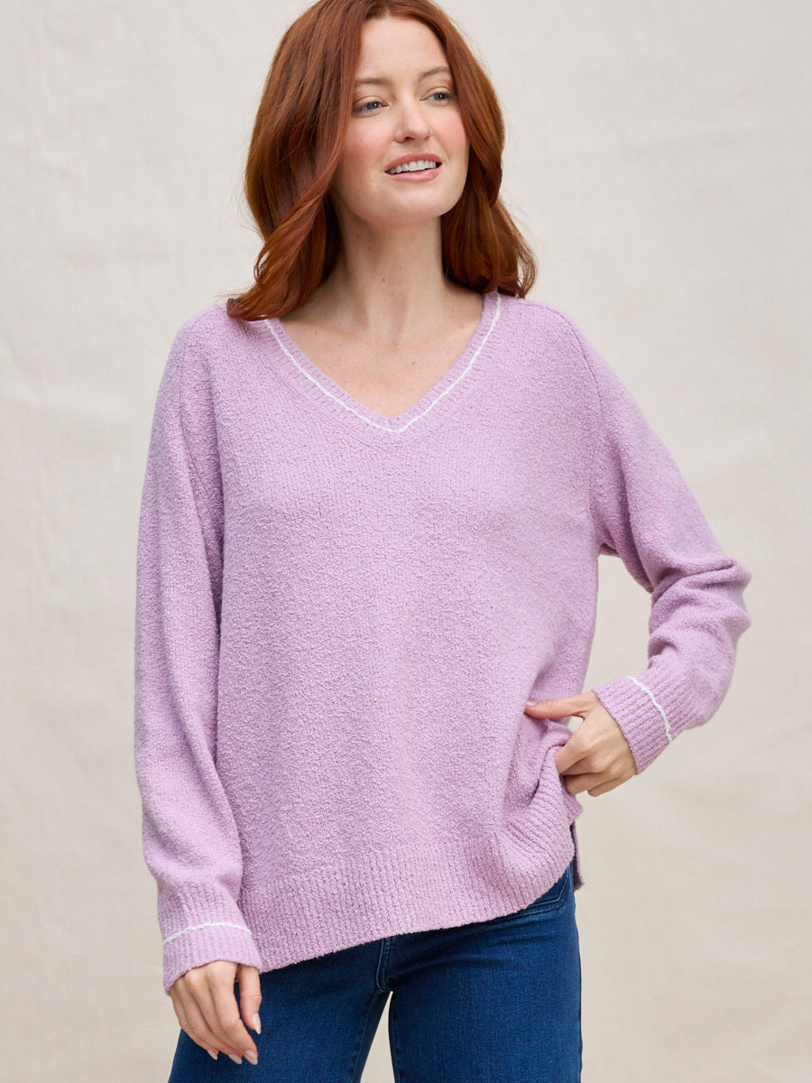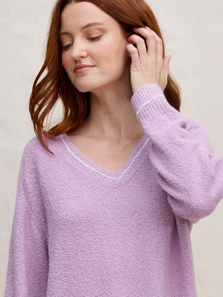 A key silhouette in our Cotton Bouclé collection, the Tunic Vee, offers luxurious ease in an elongated shape. Designed with refined saddle shoulders and ribbed trim at the neckline and cuffs, accented by a contrast stripe. The tunic length provides flattering coverage, while side slits create an easy drape at the hem, allowing it to layer beautifully over slim pants or leggings. Crafted from our super-soft, lightweight organic cotton-blend bouclé yarn and offered in rich seasonal hues, it’s a versatile staple that brings comfort and polish to everyday dressing.