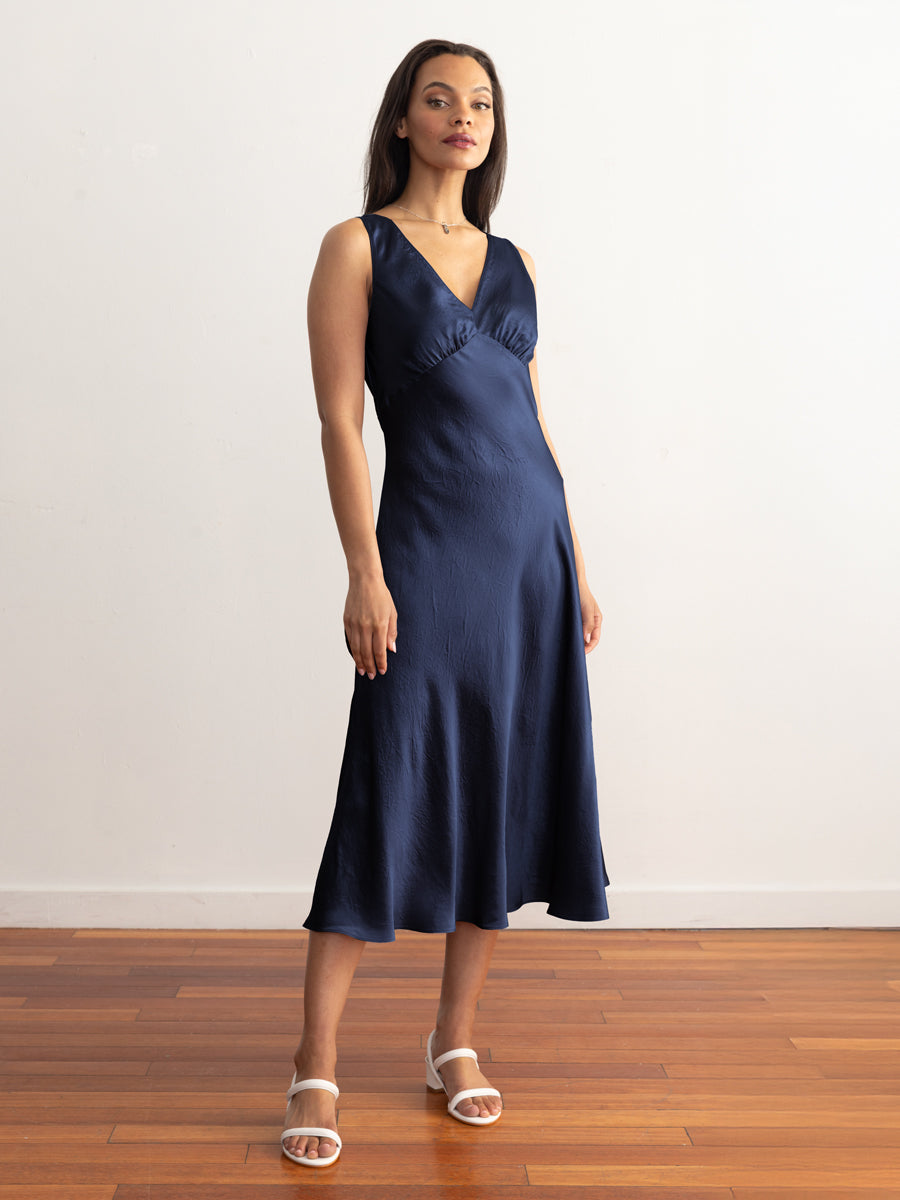 Back by popular demand, Darya returns in classic spring tones of Freesia & Navy. Romance is in the air with a double v-neck and lightly ruched bust-line. Meanwhile, the bias cutting throughout provides a body-skimming but never tight fit that feels as good as it looks. We've fallen for the slightly crinkled, twill texture of this acetic (aka acetate) fabric, which is derived from natural and renewable resources such as wood pulp.Size Fit:Model (5’9”) wears a size smallLength: 47"Chest: 17 1/2" *Measurements are taken flatFit: Airy & Body-Skimming –it’s figure flattering!Materials & Care: Read more100% AceticHand wash cold separatelyDo not bleach Do not tumble dry Line dryCool iron if neededDo not dry clean