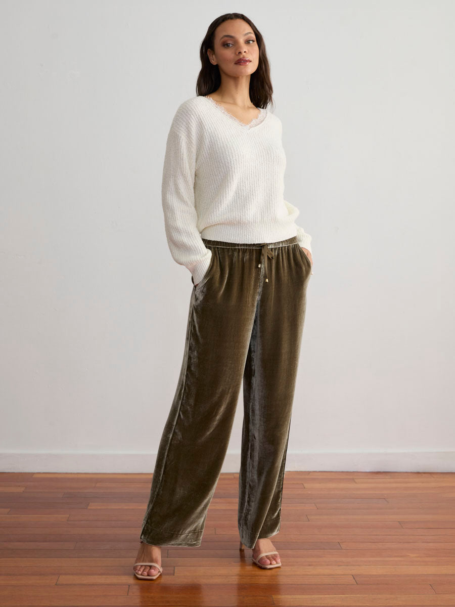 Our Lace V-Neck Pullover combines the soft boucle texture you love with delicate French-inspired lace insets — romantic details and texture that envelop you. Finished with a double-vee neckline and a cotton-banded trim for styling ease, it pairs perfectly with our Velvet Pull-On Pants for a relaxed yet refined look. A piece that feels as good as it looks — all day, every day.