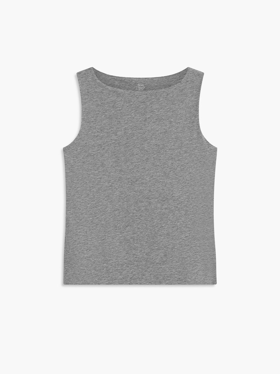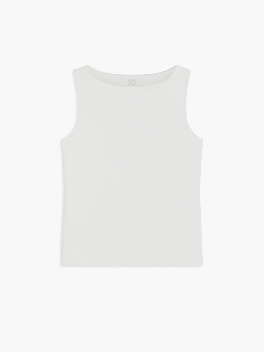 A sleek double-layer boat neck tank in soft stretch Pima cotton that supports and moves with you. The wide neckline frames the collarbones while the clean silhouette makes it an effortless standout on its own or a polished base for layering.