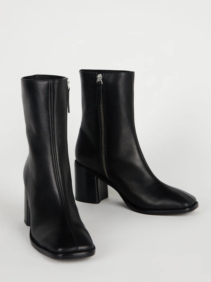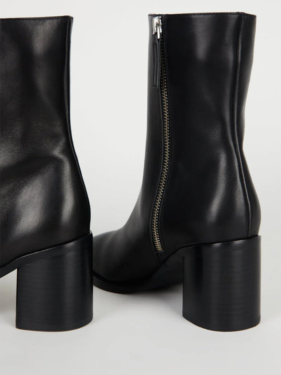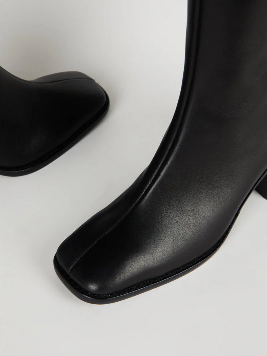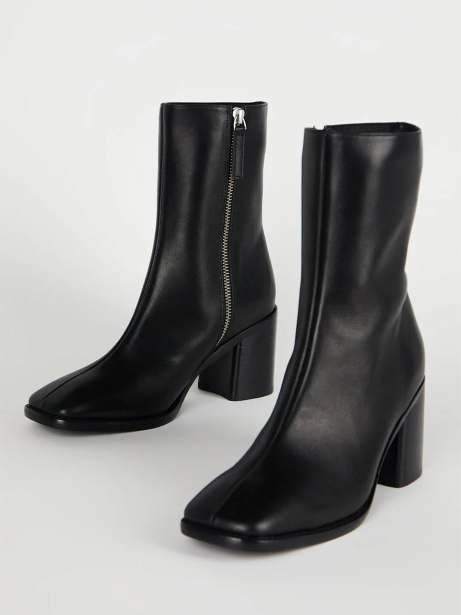 The Meet Contour boot from Intentionally Blank brings modern minimalism and everyday elegance to the forefront. Part of our ICONIC Collection, this sleek mid-high style features a signature square toe and squared-off heel—creating a refined, mod silhouette that elevates any look with ease. Handcrafted with a smooth leather upper and leather lining, Contour blends structure with softness, while its memory foam footbed delivers cushioned comfort from the very first wear. Designed to rise slightly higher than a traditional ankle boot, the slim, sculpted shaft creates a clean, elongated line that pairs beautifully with denim, trousers, and dresses alike. Loved for its versatility, premium quality, and effortlessly chic aesthetic, Contour is the go-to boot that ties every outfit together—season after season.