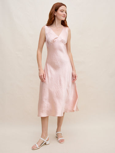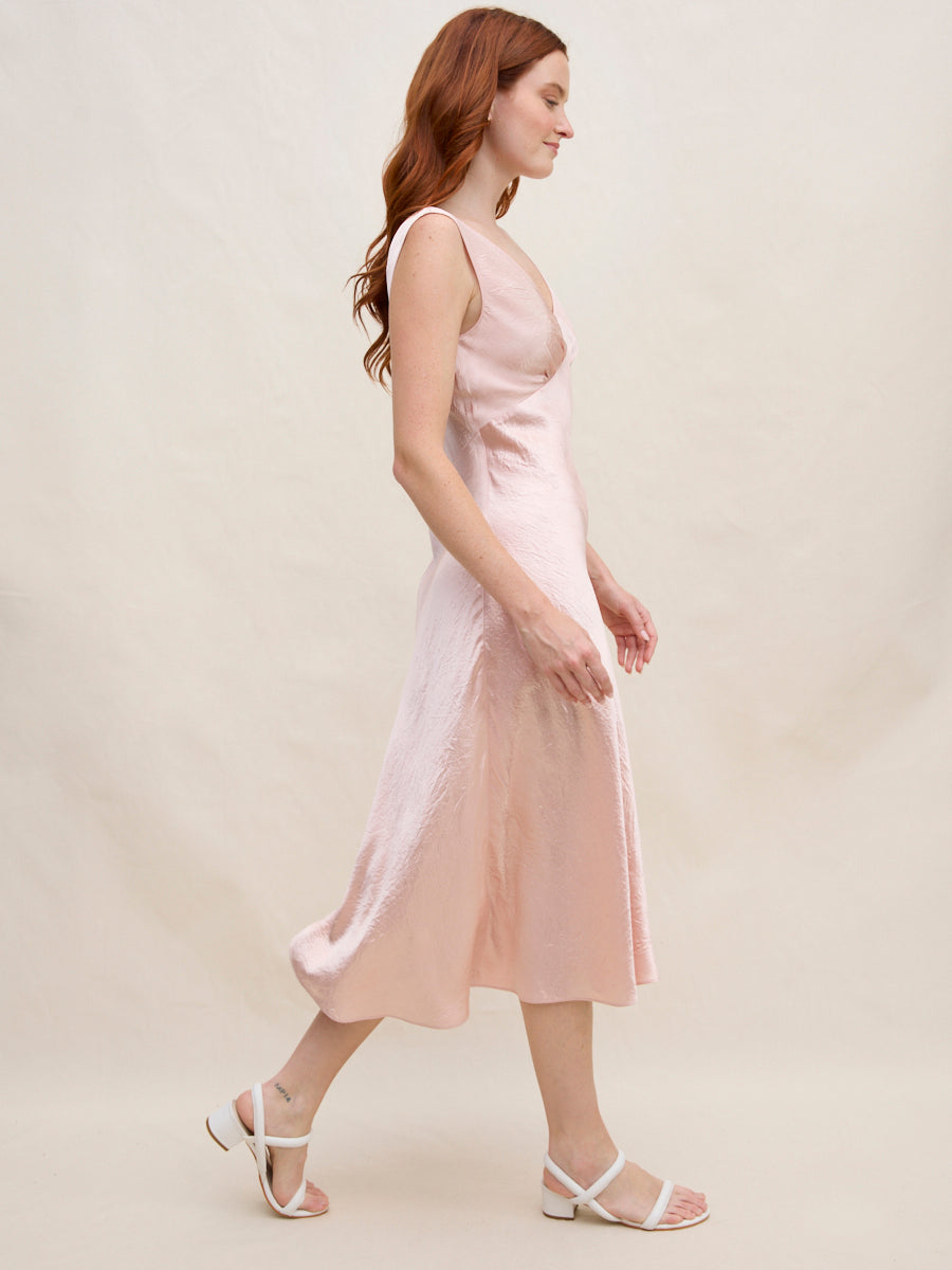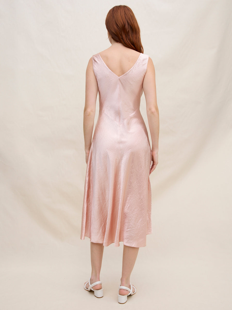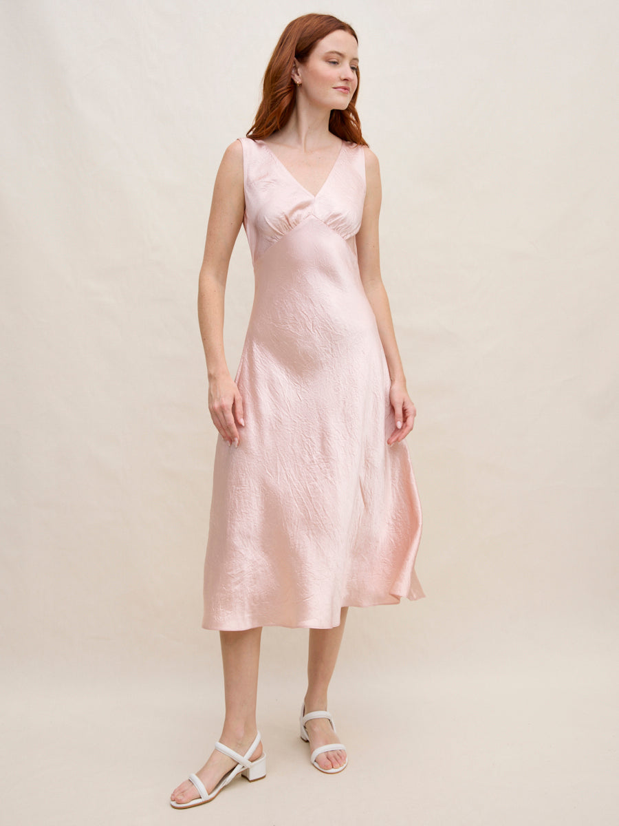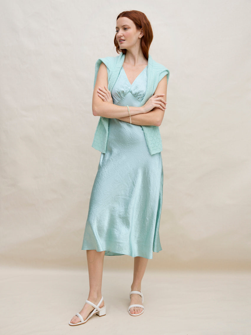 A timeless silhouette designed to move effortlessly through every occasion. Cut on the bias from fluid acetate satin, this V-neck midi dress skims the body with a soft, flattering drape and graceful movement. The polished length feels refined yet easy, making it equally suited for daytime gatherings or evening plans. Layer a sweater over top to create the look of a skirt, extending its versatility season after season.