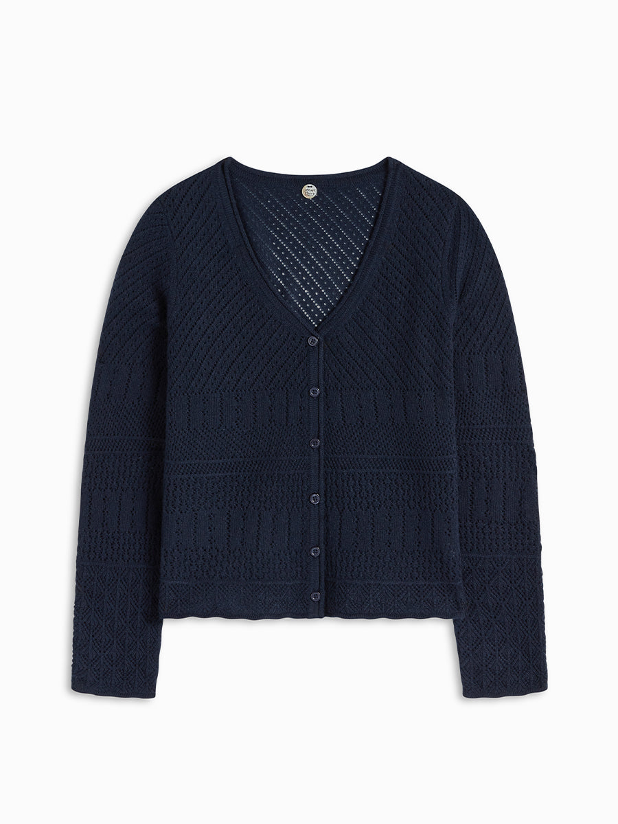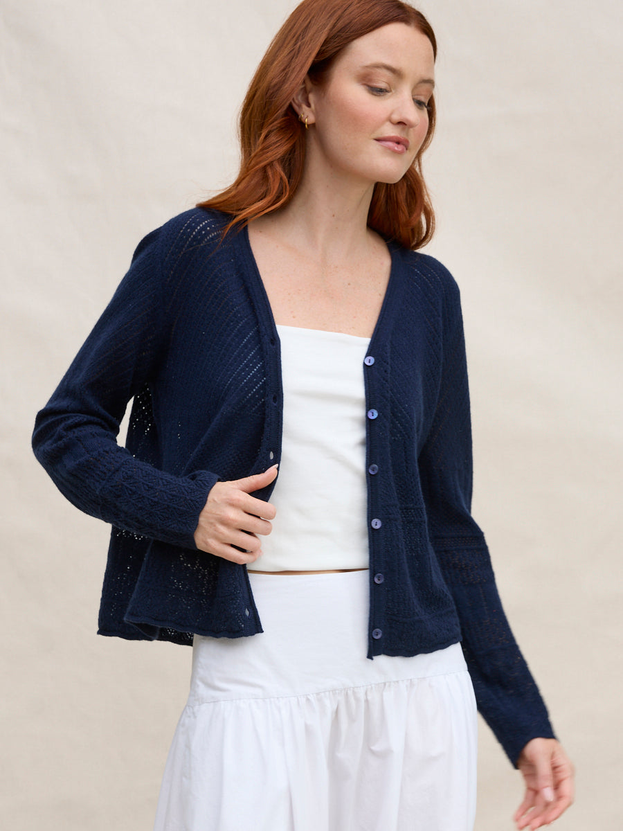 Elevate your spring wardrobe with this exquisite, lightweight cashmere Cardigan. Featuring a delicate pointelle knit and a flattering V-neck button-up silhouette, it’s airy yet luxuriously soft. Perfect for layering, it pairs effortlessly with our Sabi Skirt or works beautifully as a dress topper for a polished, versatile look. A timeless piece that combines elegance, comfort, and effortless style for the season.