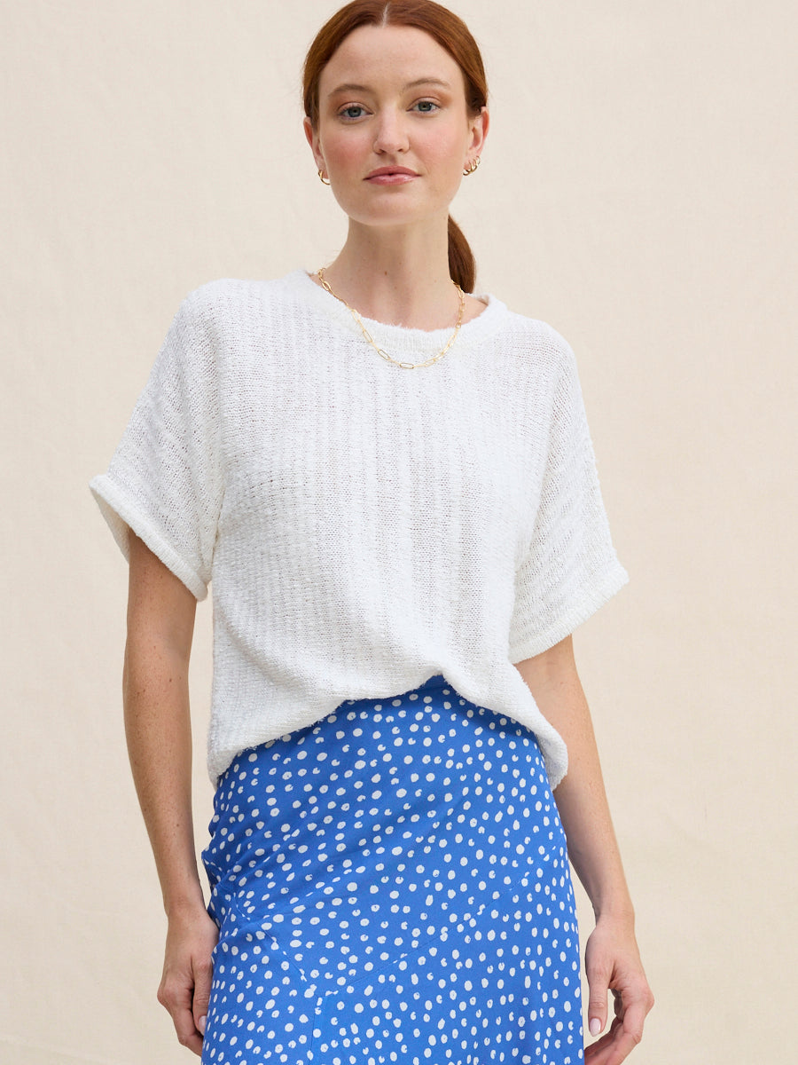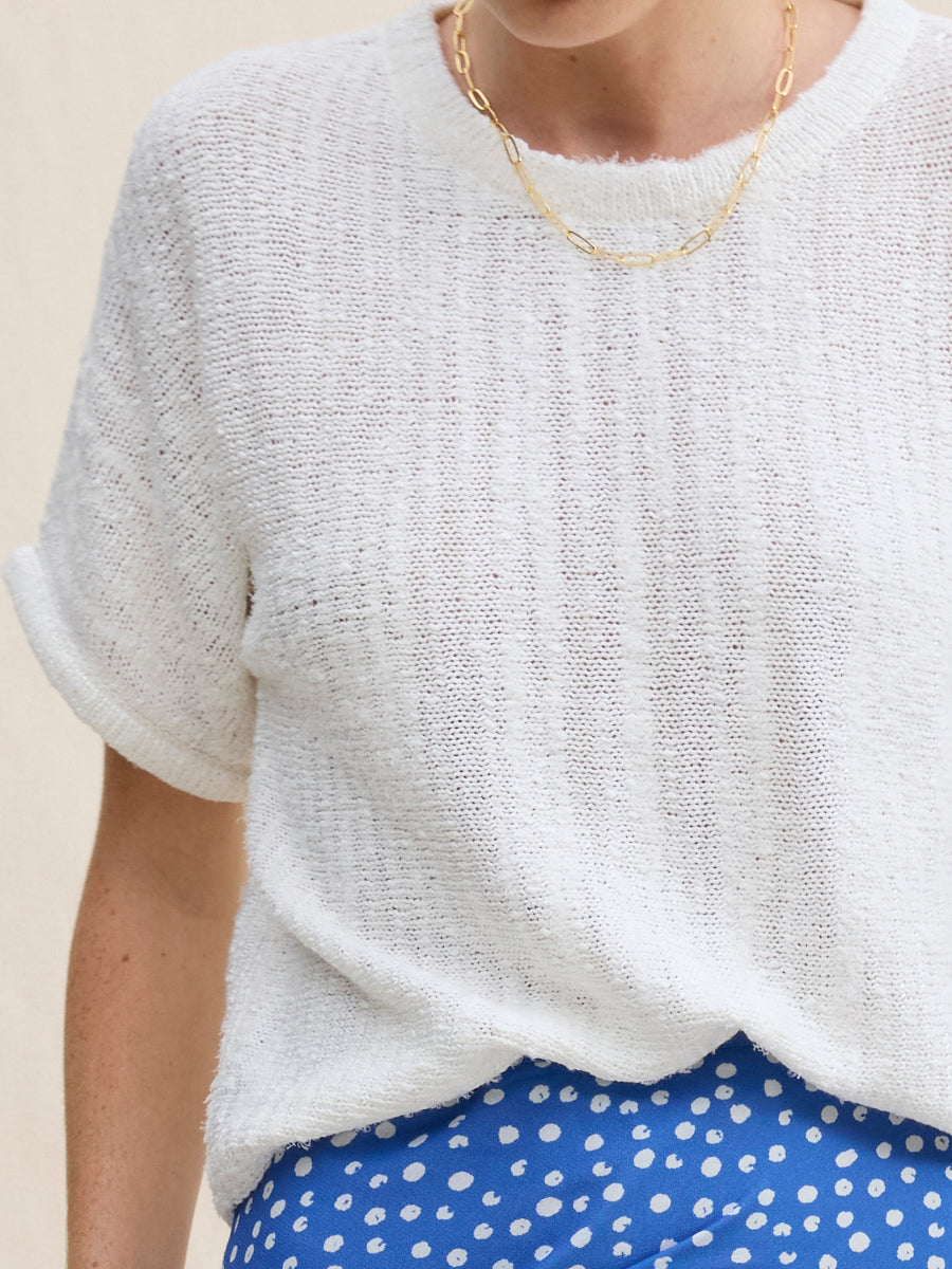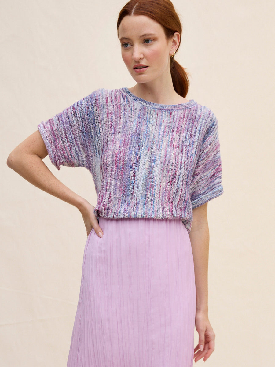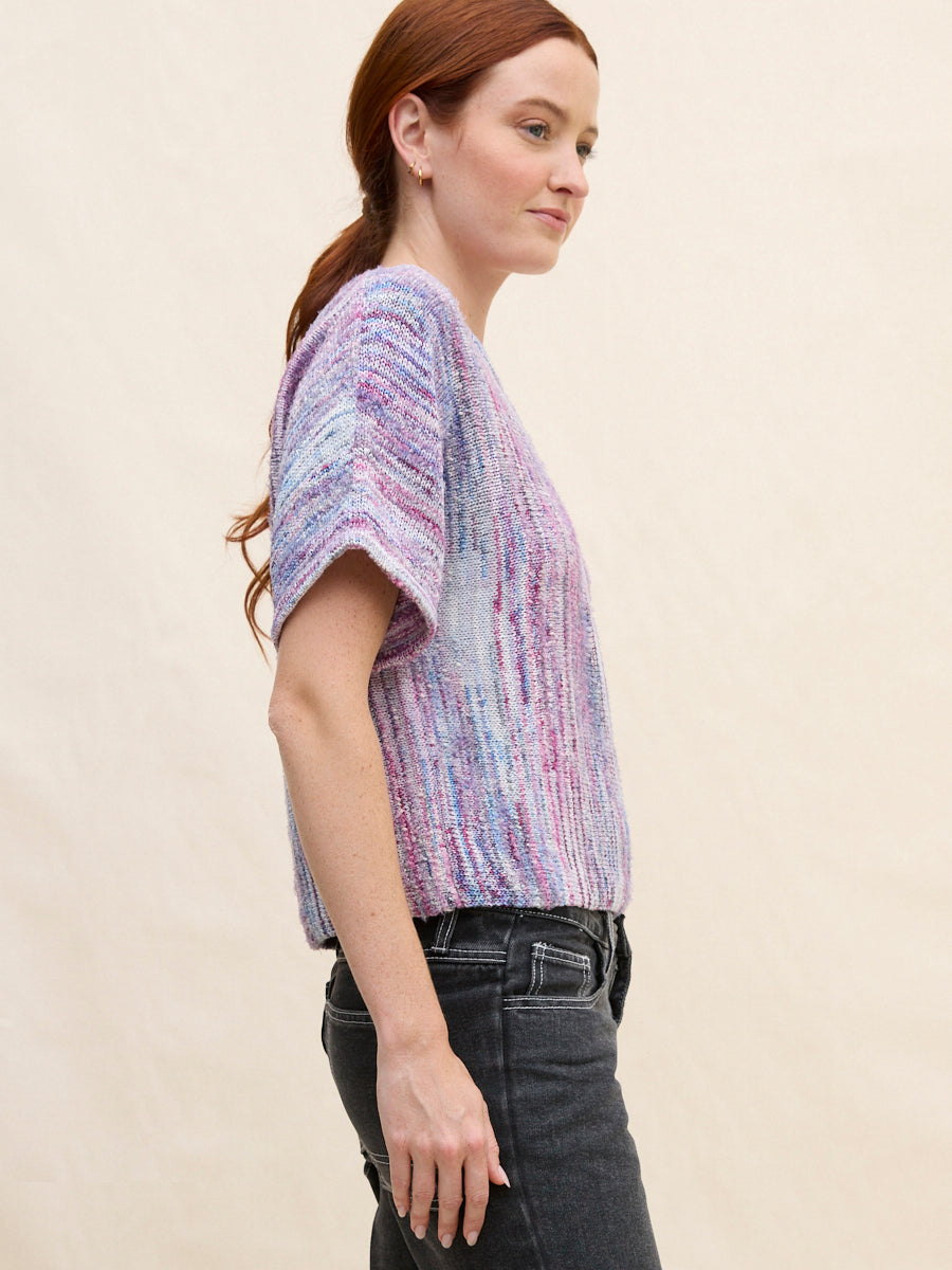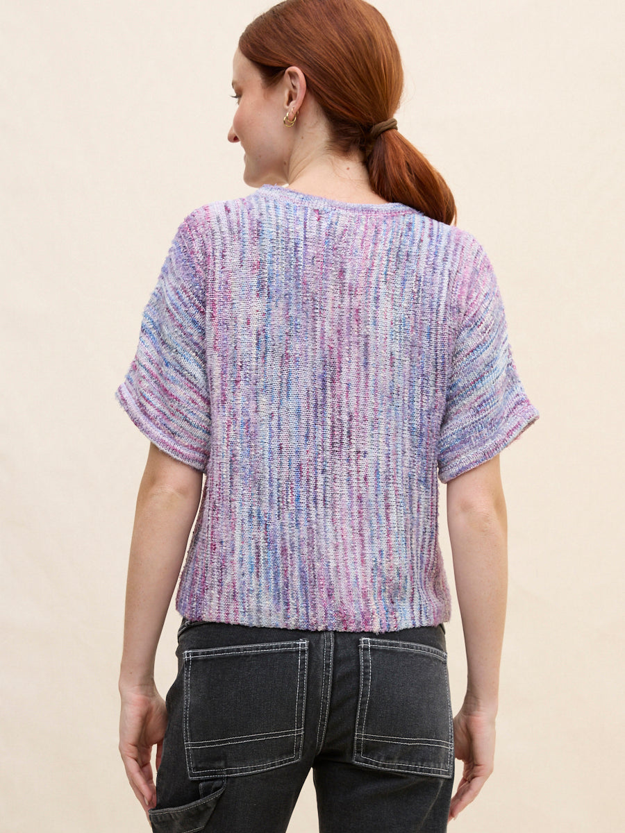 Honoring Margaret's playful, artful spirit, this piece is made from space-dyed, slubby Italian yarns creating a work of art you can wear. Its vertical knitting construction creates a softly elongating effect, and an imperfect, beautifully randomized pattern to the surface. The nubby texture adds depth and character, giving it a handmade feel. Easy to style yet full of personality, it’s a knit that stands out without trying too hard.