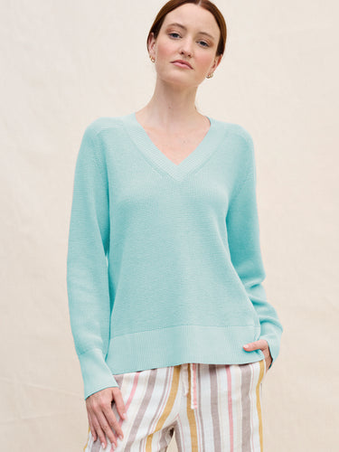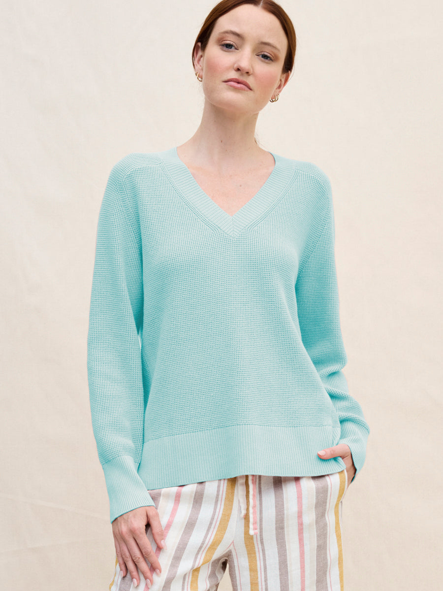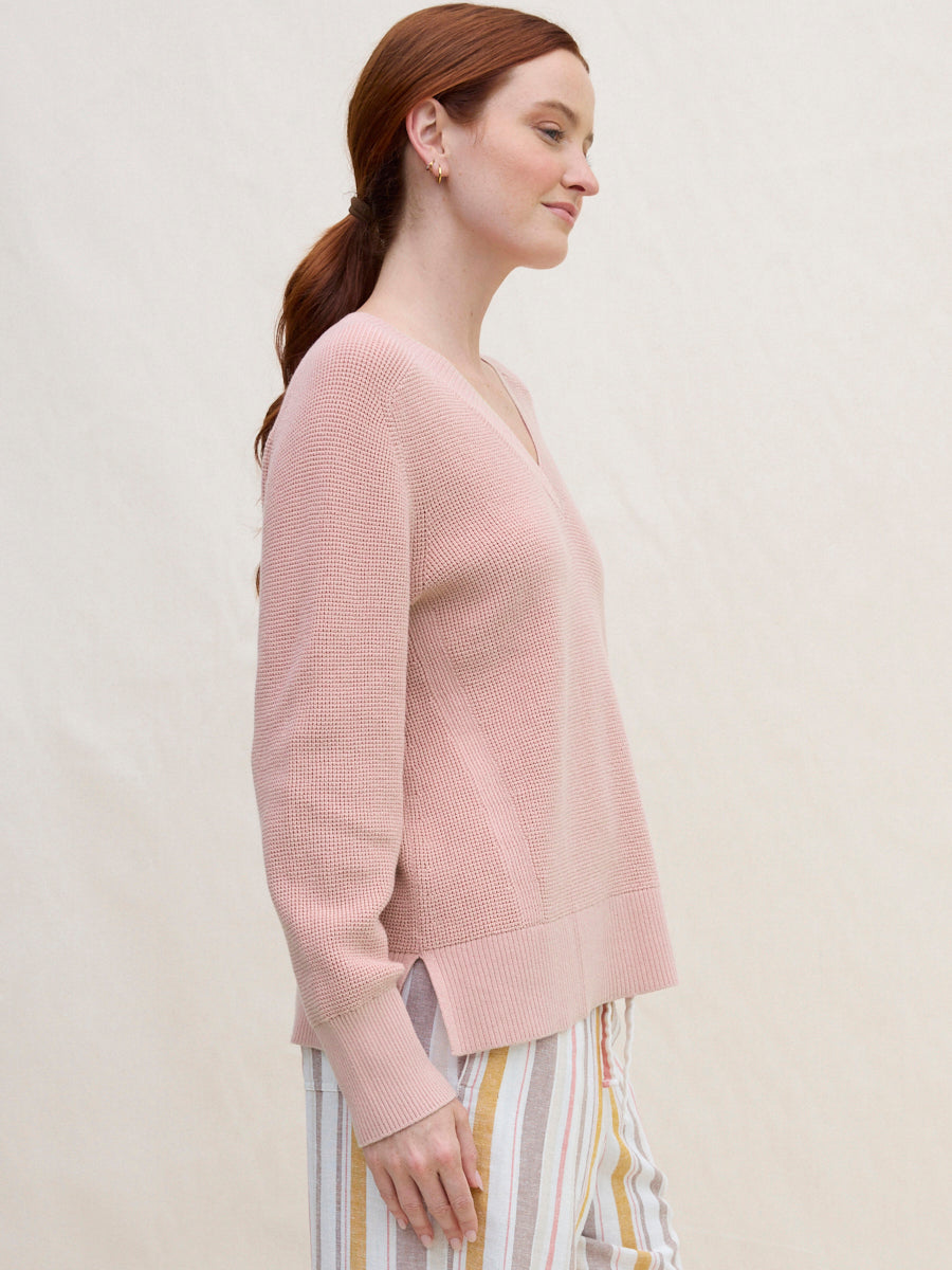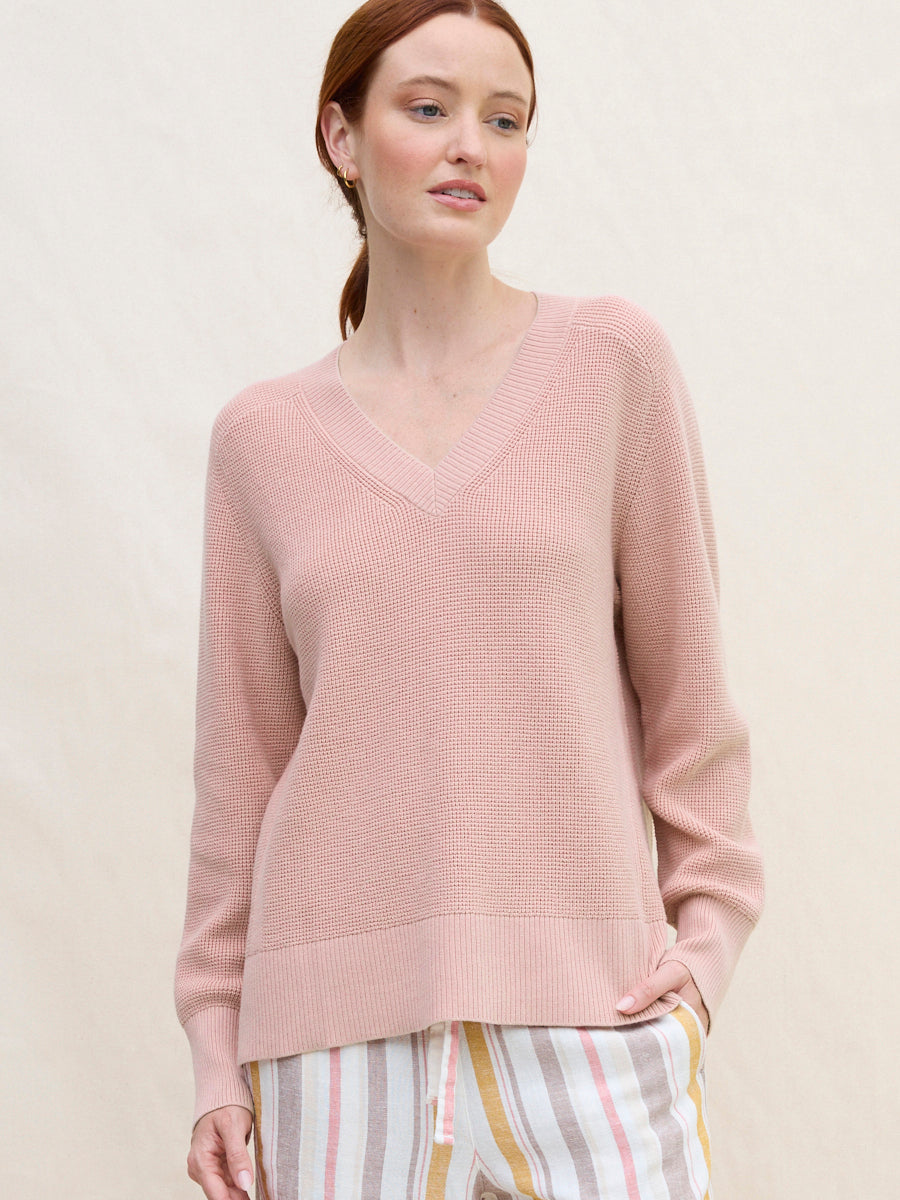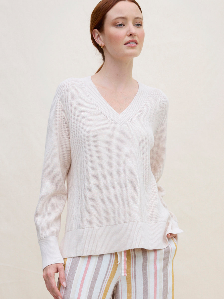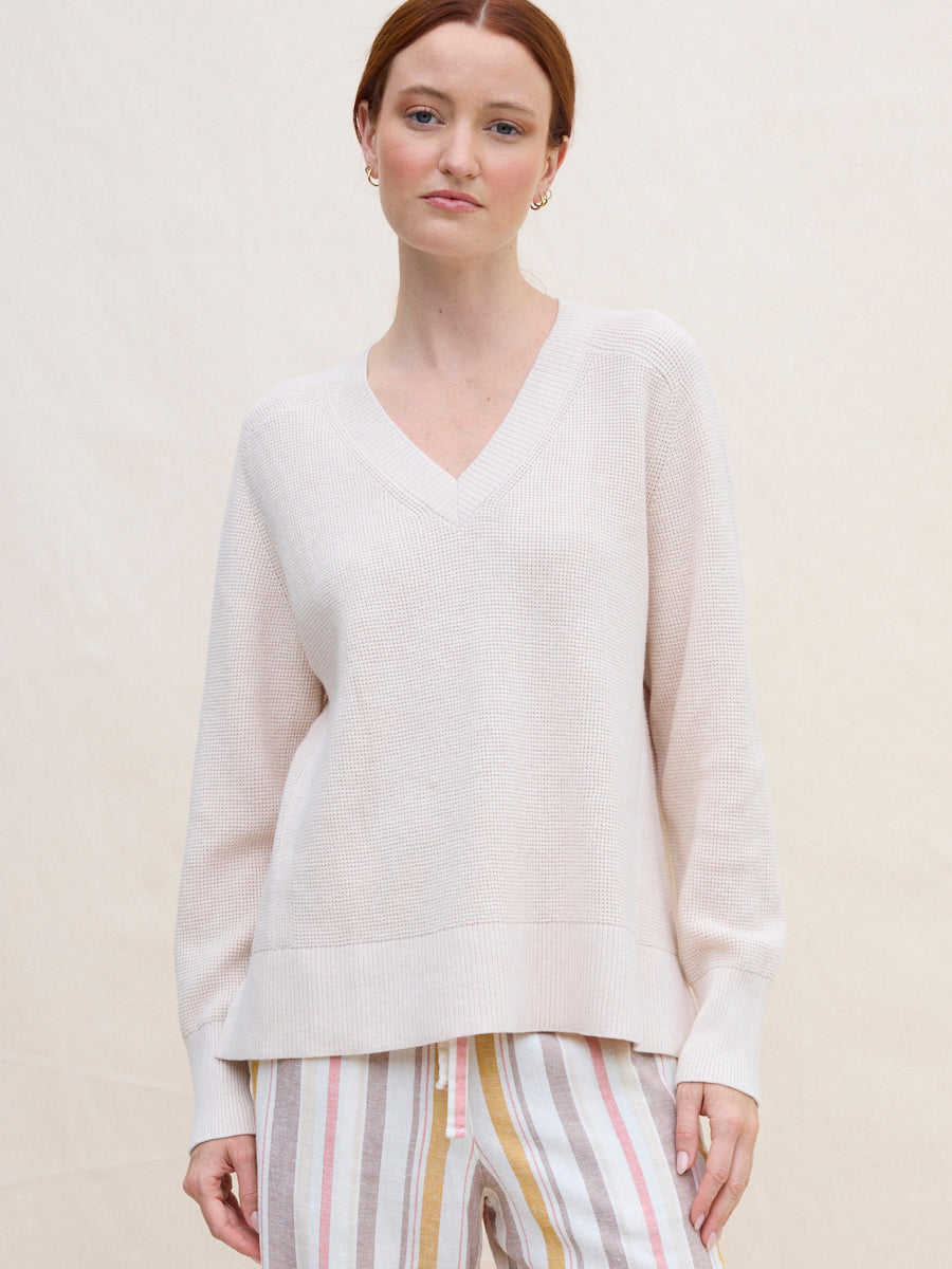 The Hilary Vee waffle knit sweater is defined by a drapey, drop-shoulder silhouette and a roomy, lightweight fit that falls past the hips. Finished with a ribbed hem, subtle side slits, and a flattering ribbed V-neckline perfect for layered necklaces and your favourite denim.