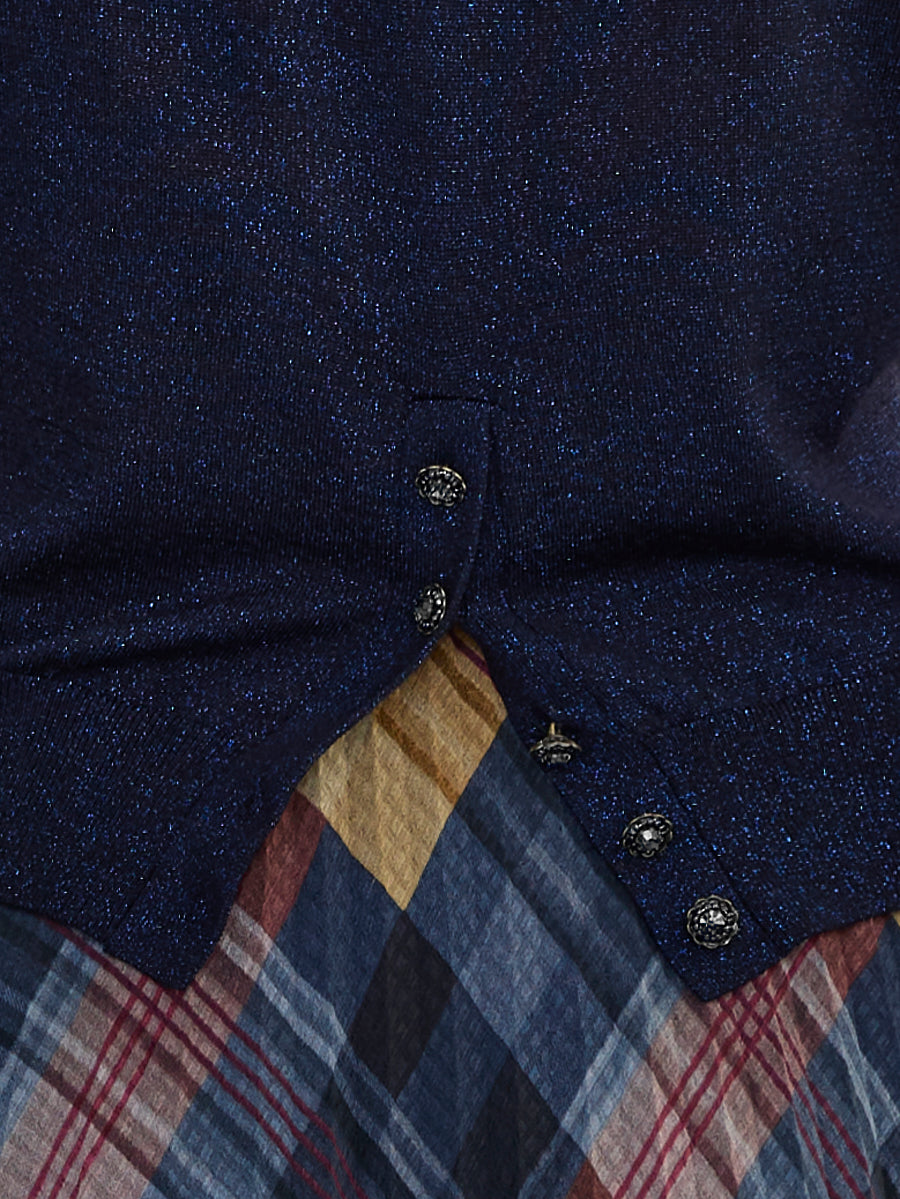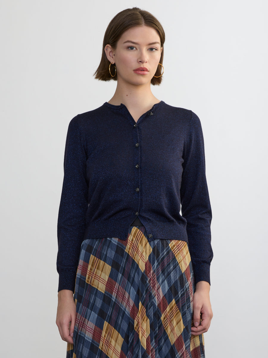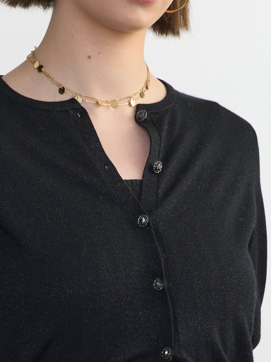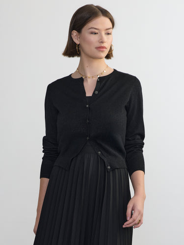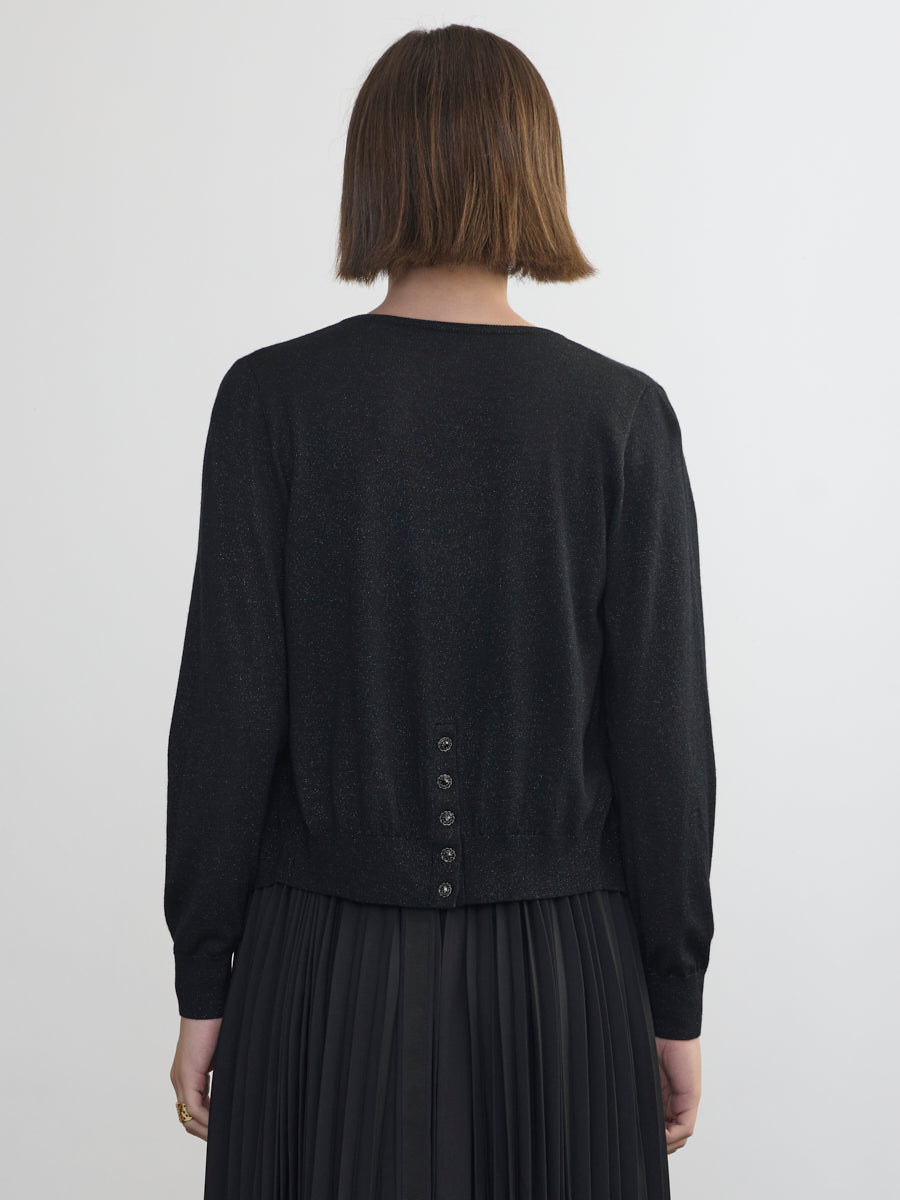 Elevate your look with this stunning cardigan, designed to make every evening feel special. Featuring fully fashioned buttons that add a unique touch to each wear, and a 1/3 button-back design for an adjustable waistline fit. Woven with all-over sparkle metallic lurex, it catches the light beautifully. The classic silhouette and delicate details make it versatile; wear it as a chic top with jeans or layer it over an evening skirt for effortless elegance.