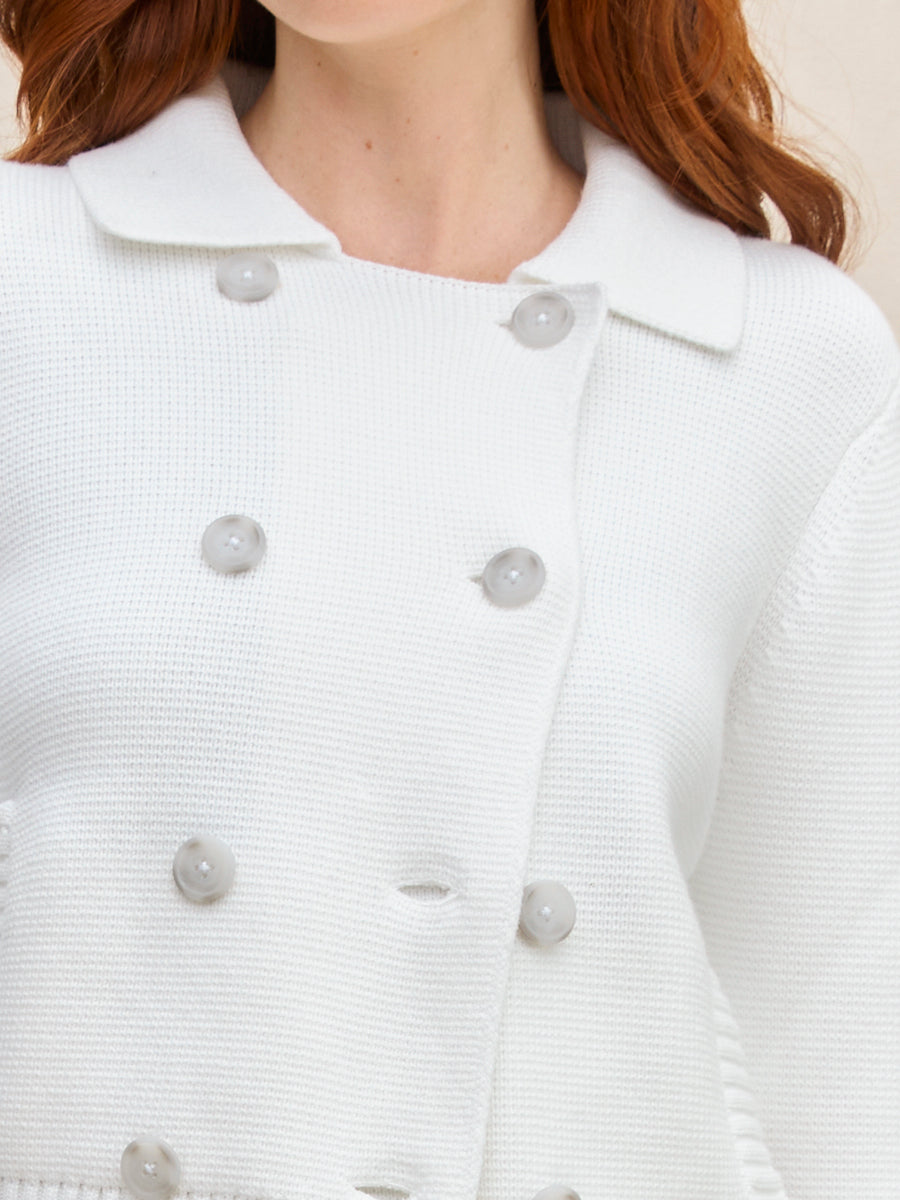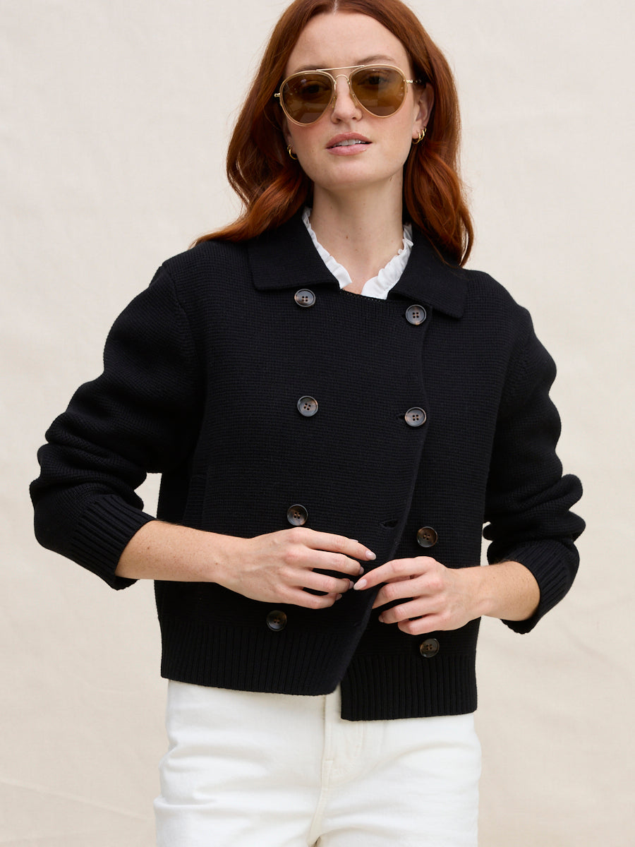The Dylan Double Knit Jacket is a timeless layer designed with a tailored yet comfortable feel. Crafted from soft cotton in a cozy double-knit Milano stitch, this long-sleeve, double-breasted knit jacket features a classic collar and two functional front pockets for everyday ease. Polished enough for work and relaxed enough for weekend wear, Dylan is the perfect women’s cotton knit jacket to elevate denim, trousers, or soft separates throughout the season.