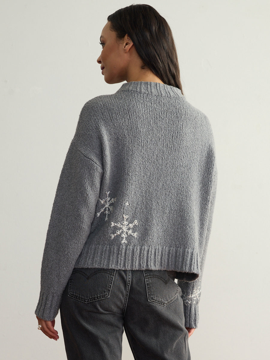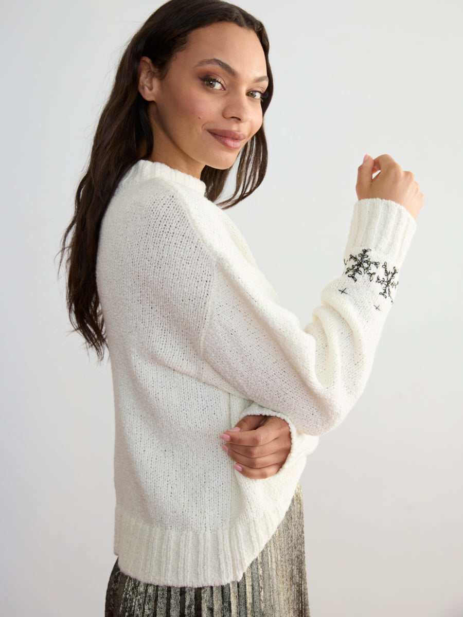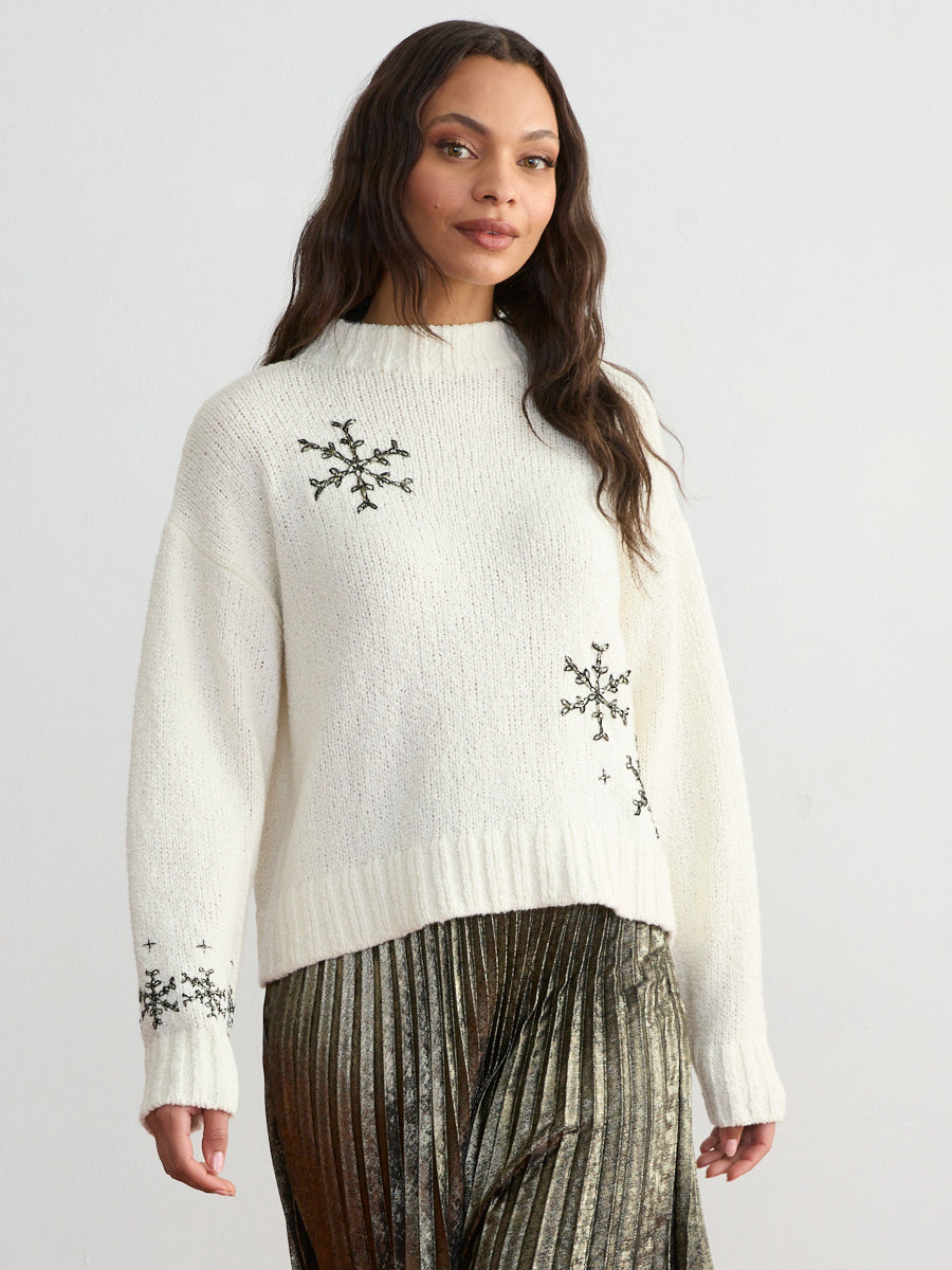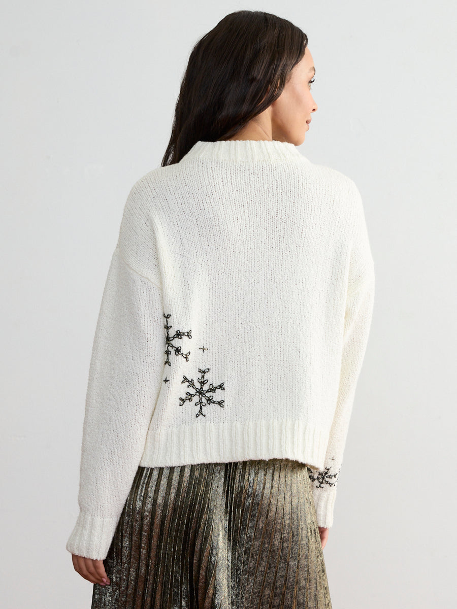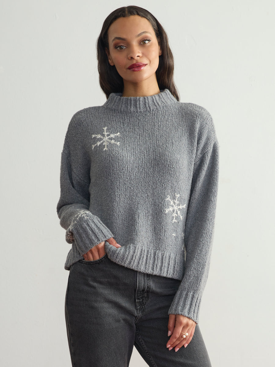 Her name is Snowflake Mock, and she’s a handstitched showstopper! With its elevated mock neck and cozy winter vibe, this is the perfect pullover for layering on chilly days or adding a touch of charm to your everyday look. Crafted from our best-selling boucle fabric that is lightweight, soft, and breathable, she features a delicate snowflake design handstitched from a sketch hand-drawn by Margaret herself. We are here to tell you, once you slip into this artful, sweatshirt-soft layer, you won’t want to take it off.