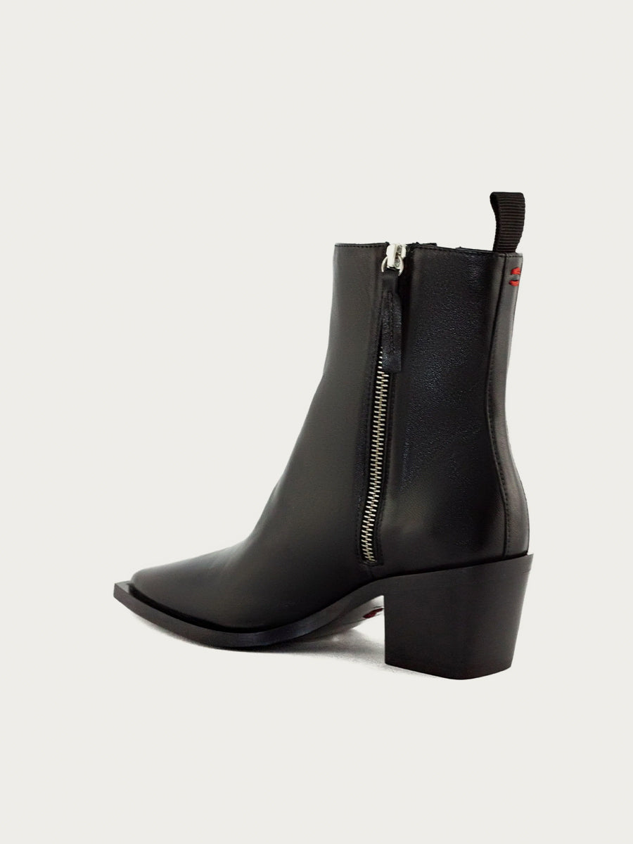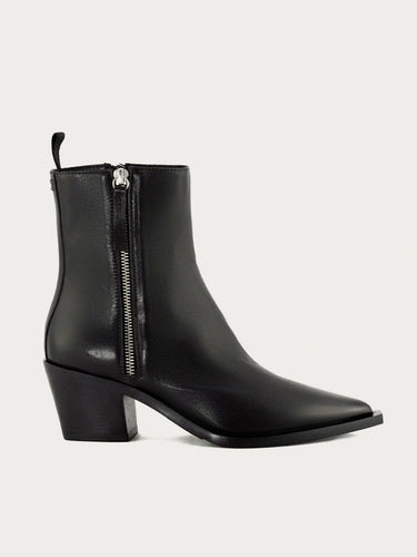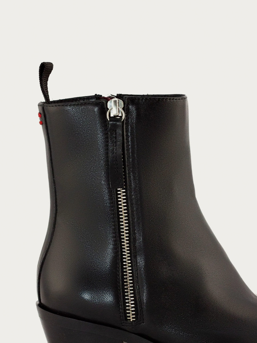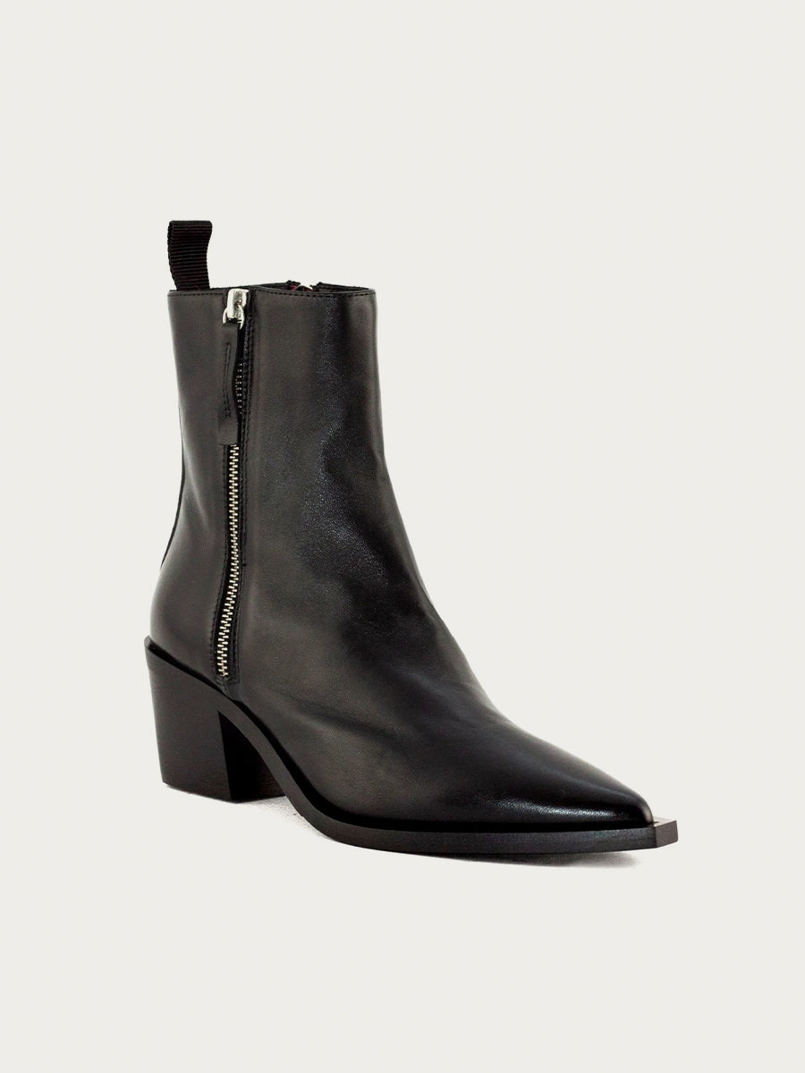 The TABY37 boot from Halmanera brings a refined, modern edge to the classic western silhouette. Handcrafted in Italy, this sleek style is sculpted from smooth black leather, offering a rich, polished finish that elevates everything from denim to tailored looks. The elongated pointed toe creates a sharp, flattering line, while the architectural block heel adds subtle height with all-day stability. A full side-zip closure ensures an easy, streamlined fit, and the all-leather lining enhances comfort as the boot molds beautifully to the foot over time. Grounded by a durable rubber outsole, TABY37 delivers both sophistication and longevity—an effortless blend of Italian craftsmanship and western-inspired attitude.