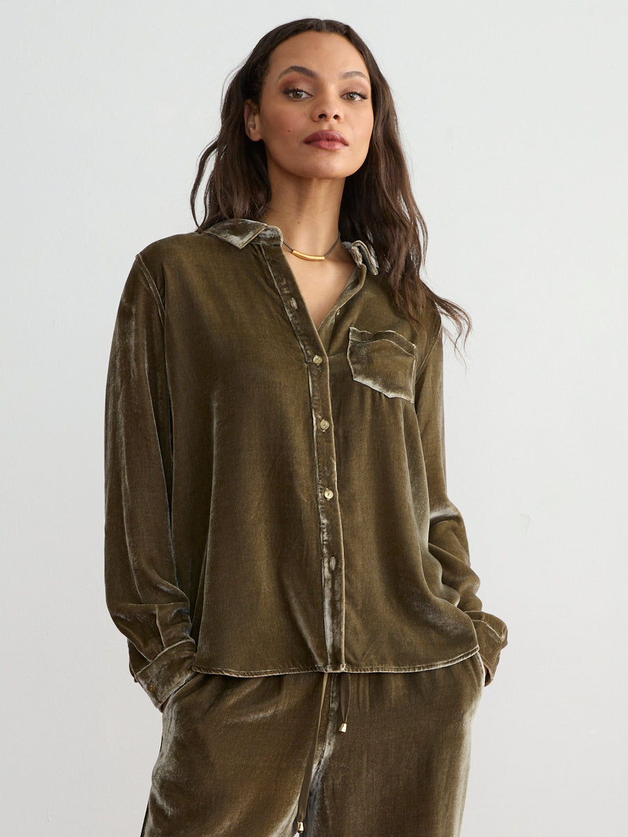 Celebrate in style with the return of our best-selling Velvet Button-Down Shirt. Crafted from a sumptuous viscose-silk blend, this top is endlessly soft against the skin, pairing the plush richness of velvet with the silky smoothness of silk. Perfect for festive soirées or casual gatherings, its luminous sheen and rich color make it a true wardrobe essential. Thoughtfully designed for both comfort and refinement, the shirt features a single pocket, classic button-down styling, and a tailored fit that flatters your silhouette.