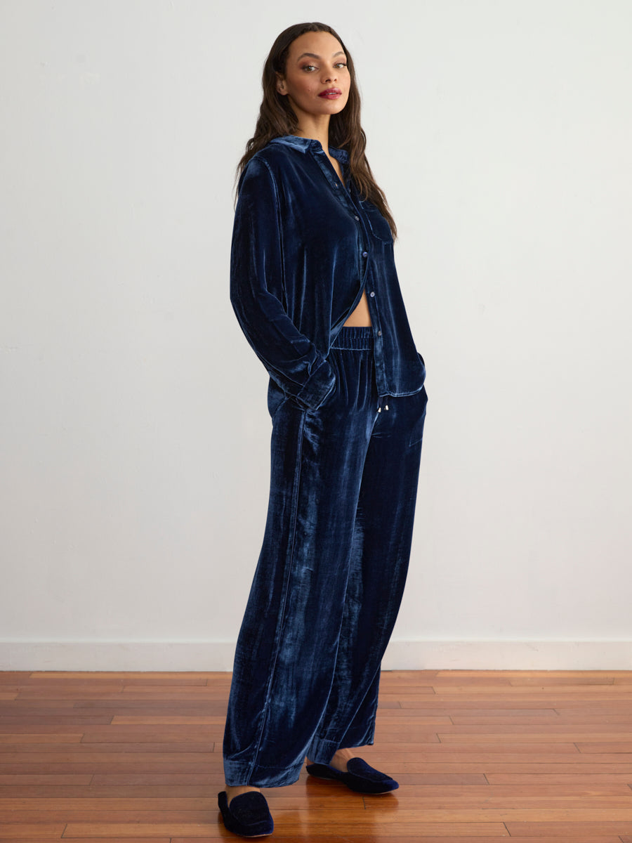 Meet the perfect companion to our Velvet Button-Down Shirt: these matching pants bring comfort and sophistication in equal measure. Crafted from a sumptuous viscose-silk blend, this top is endlessly soft against the skin, pairing the plush richness of velvet with the silky smoothness of silk. Featuring a relaxed trouser fit and an adjustable drawstring waist, they offer effortless ease while maintaining a polished silhouette. Perfect for dressing up or lounging in style!